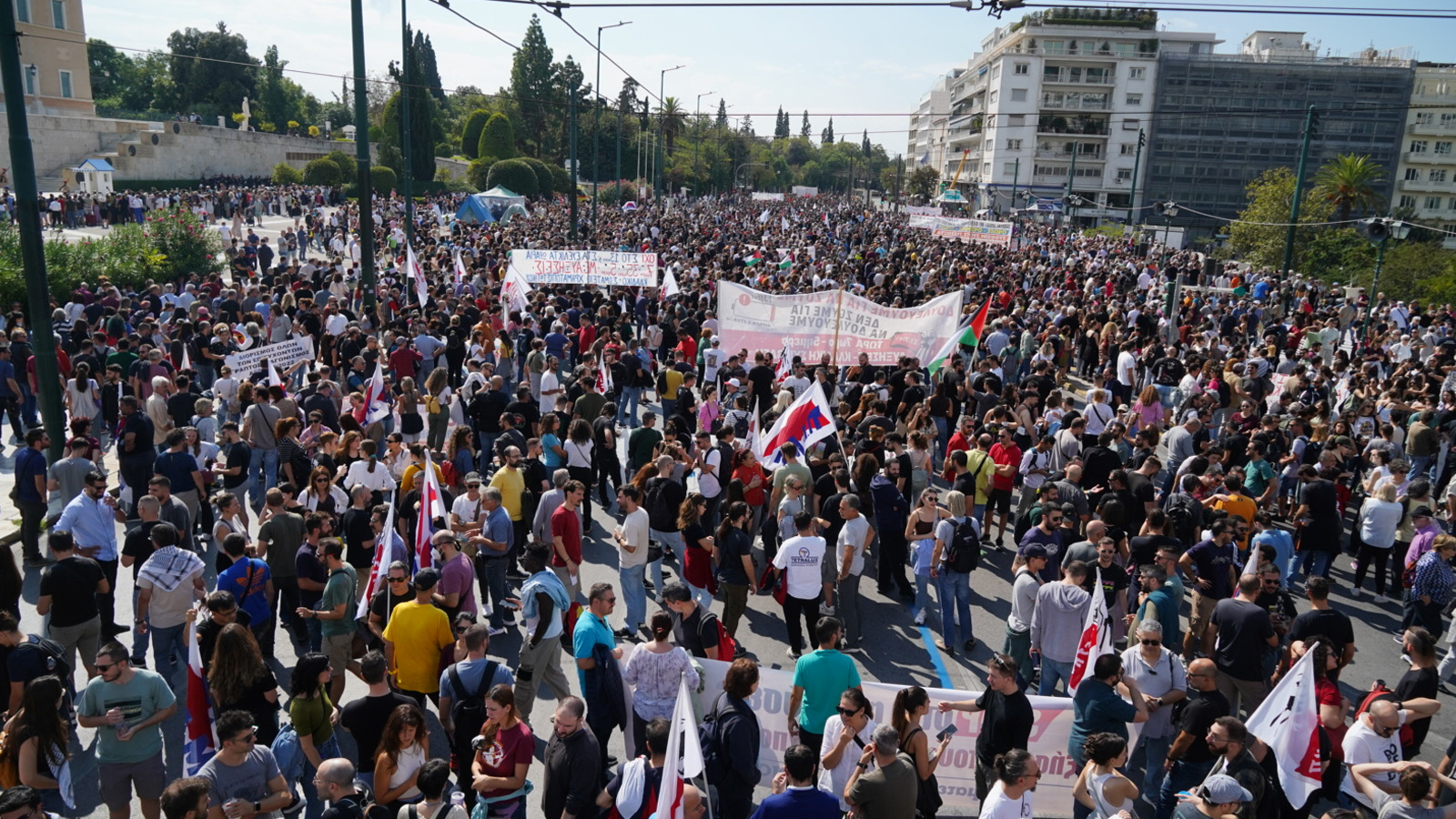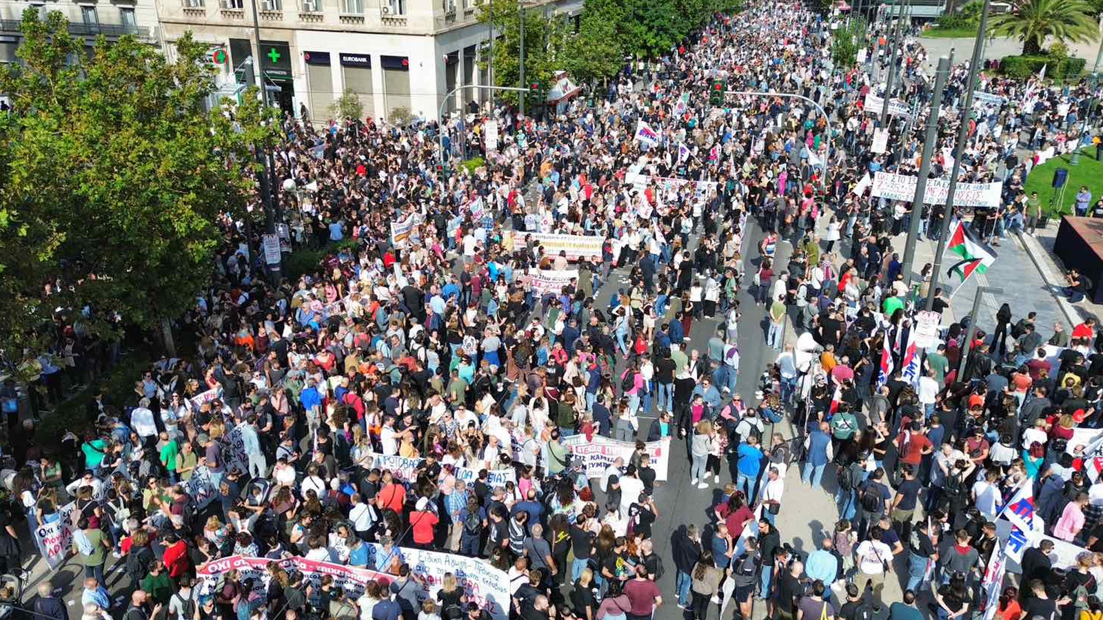 هذا و سجَّل بيان صادرٌ عن جبهة النضال العمالي "بامِه" في سياقه: «إن المشاركة الكبيرة في الإضراب والمظاهرات تُعربُ عن السخط المتراكم تجاهَ السياسة المعادية للشعب إجمالاً، والتي حوّلت مواقع العمل إلى ساحات موت. و تجاهَ الغلاءِ الذي يَلتهم دخل الشعب، و صحة الشعب التي أصبحت سلعة باهظة الثمن، و المدارس التي افتتحت بآلاف الوظائف الشاغرة وبتكلفة باهظة لتعليم أطفالنا. و تجاه المعاشات التقاعدية المقتطعة التي لا تكفي من أجل حياة كريمة في سن الشيخوخة. حيث أُعربَ عن مناهضة تورط بلدنا في الحروب الإمبريالية الدموية ودعم الحكومة اليونانية لنتنياهو القاتل ودولة إسرائيل القاتلة التي ترتكب إبادة جماعية بحق الشعب الفلسطيني. و تجاه ميزانيات الدولة المتنامية من أجل برامج تسليح الناتو، في الوقت الذي لا تُحسب فيه قيمة لحياة البشر و تُعتبر قابلة للاستهلاك، كما ثَبُتَ من جريمة تِمبي". (...)